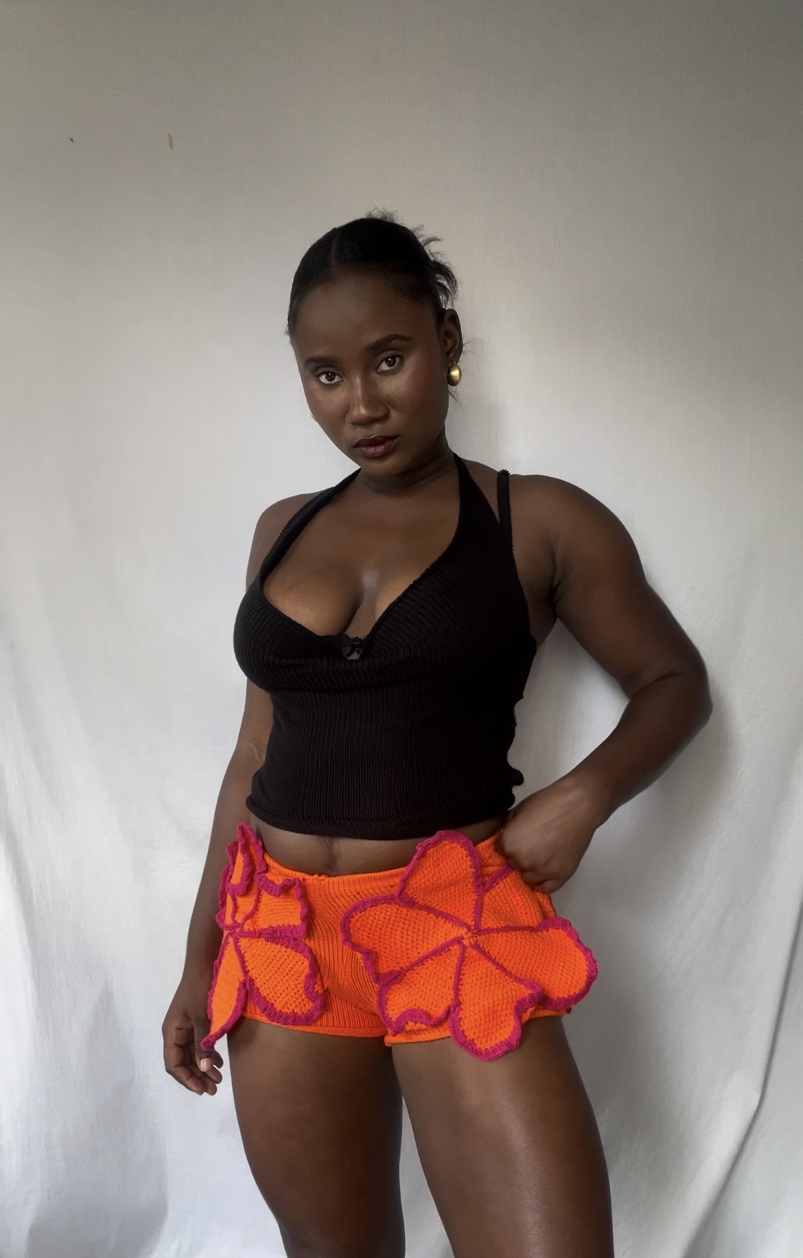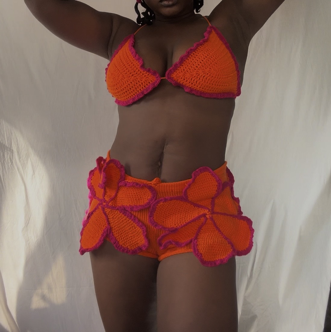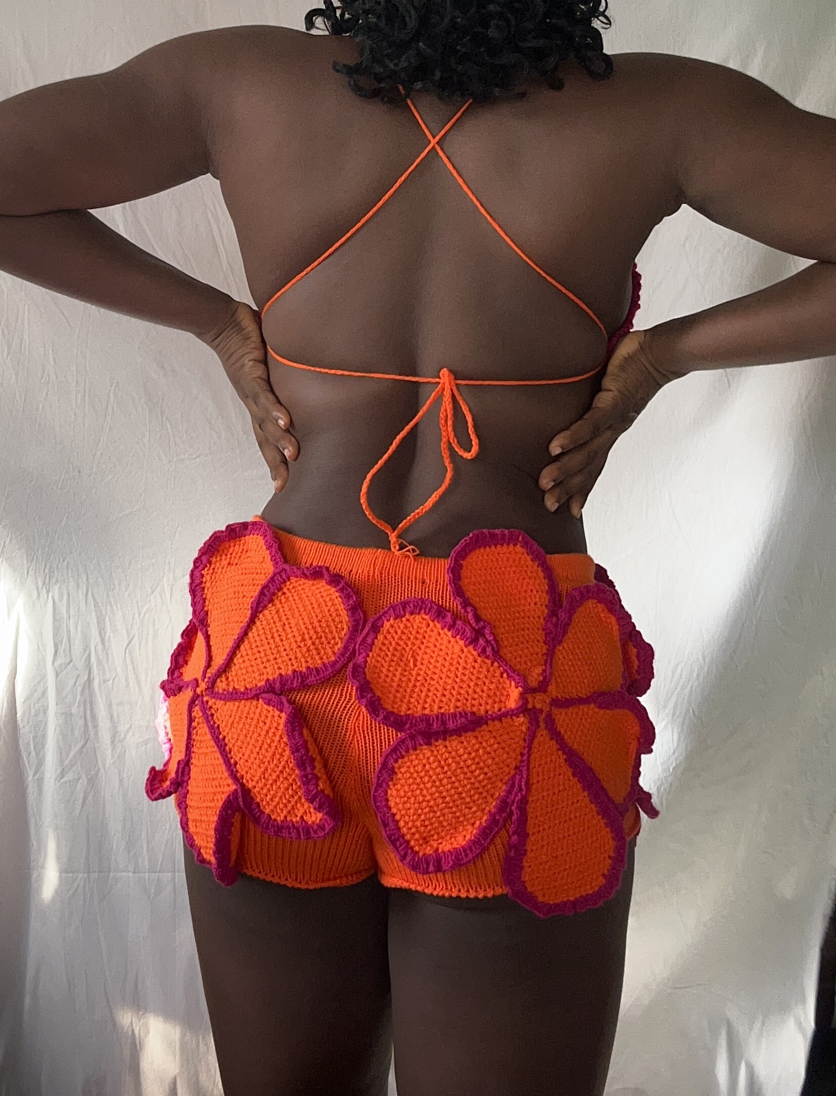 The Bon Bon Set: A chic crochet bralette and knit shorts ensemble. The micro shorts feature stunning 3D crochet flower appliqués, adding a striking statement to your look. Paired with a beautifully crafted crochet bralette with ruffled trim, this set is both playful and elegant.