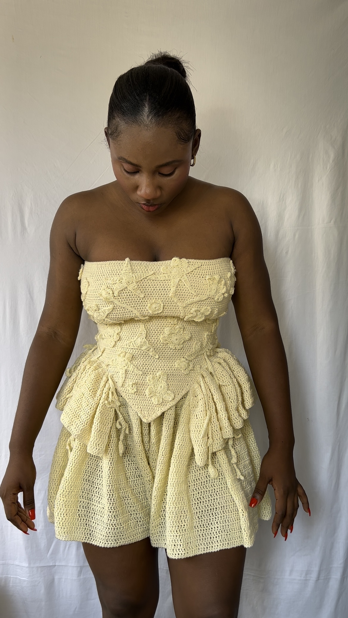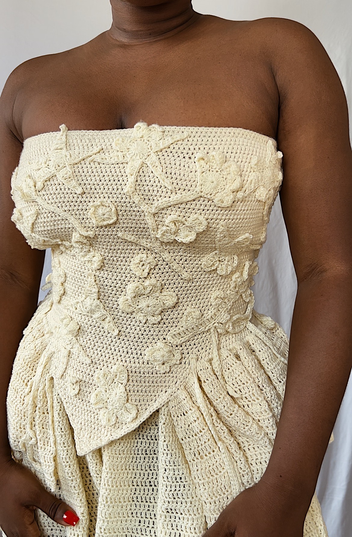The Thato Top is a crochet drop-waist bustier and lace-up tube top. Ruffled details along the sides create the illusion of a smaller waist, enhancing a flattering silhouette. The top features delicate hand-stitched crochet appliqués for added elegance.